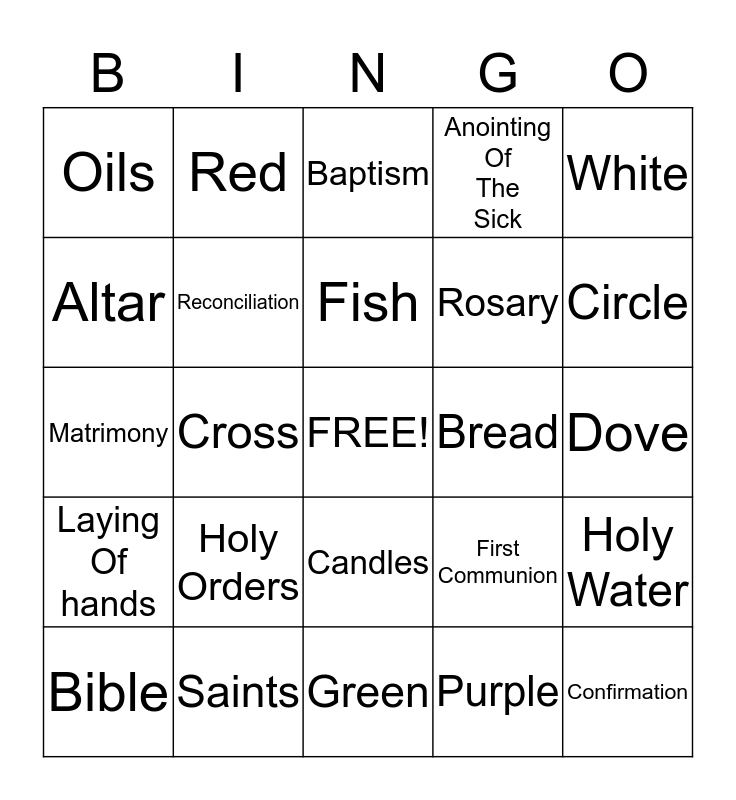 This bingo card has a free space and 24 words: Holy Orders, Saints, Fish, Bible, White, Oils, Altar, Red, Bread, Candles, Rosary, Matrimony, First Communion, Holy Water, Reconciliation, Purple, Dove, Baptism, Circle, Cross, Confirmation, Laying Of hands, Anointing Of The Sick and Green.