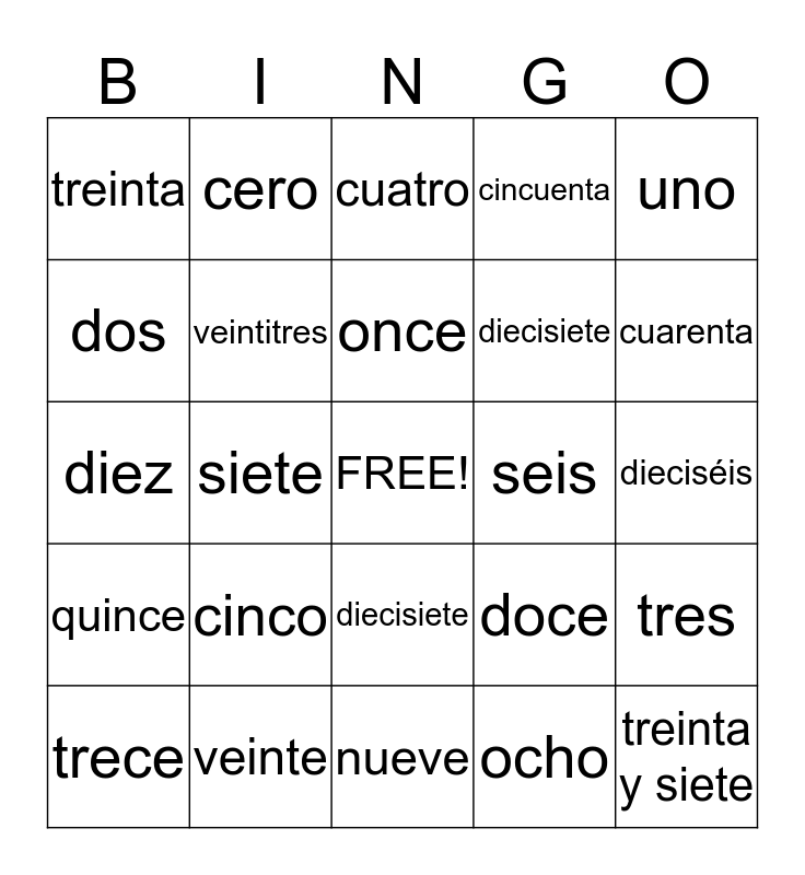 This bingo card has a free space and 24 words: cinco, veinte, once, trece, uno, treinta, dos, cero, seis, diecisiete, diecisiete, diez, doce, tres, veintitres, ocho, dieciséis, cuatro, cuarenta, siete, treinta y siete, quince, cincuenta and nueve.