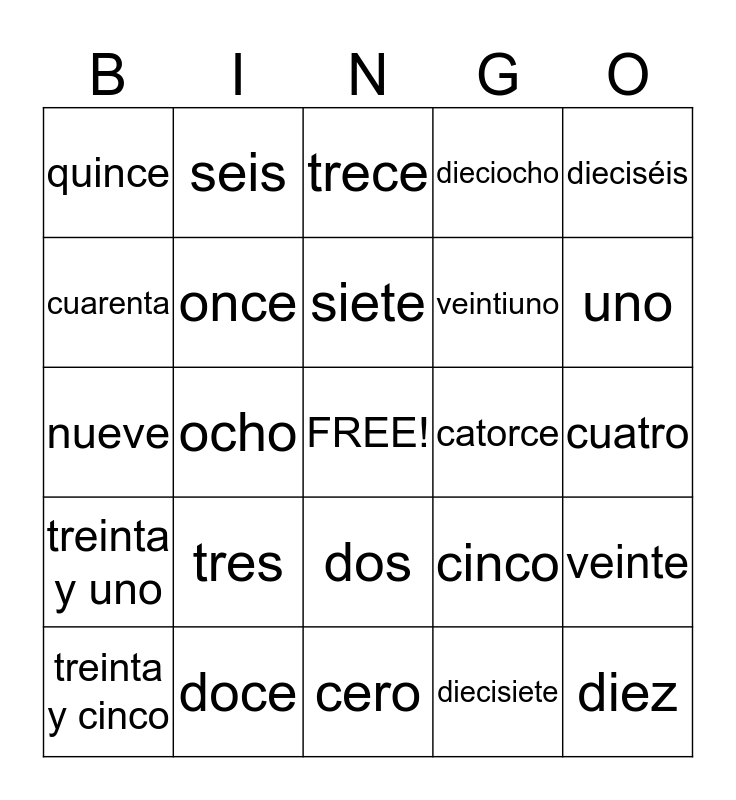 This bingo card has a free space and 24 words: tres, doce, siete, treinta y cinco, dieciséis, quince, cuarenta, seis, catorce, dos, veintiuno, nueve, cinco, veinte, once, diecisiete, cuatro, trece, uno, ocho, diez, treinta y uno, dieciocho and cero.