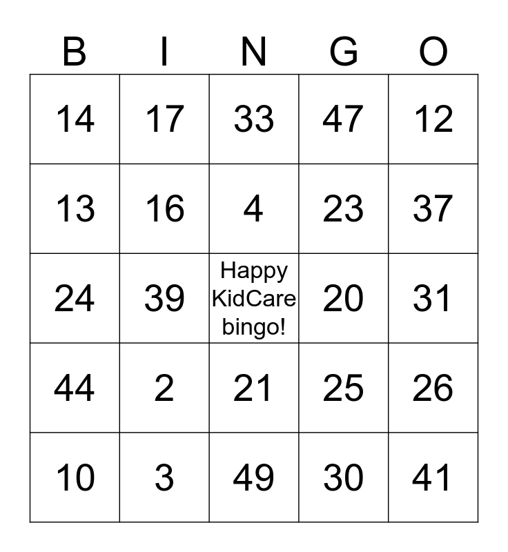 This bingo card has a free space and 24 words: 2, 3, 4, 10, 12, 14, 13, 17, 20, 21, 23, 24, 25, 26, 16, 30, 31, 33, 37, 39, 41, 44, 47 and 49.