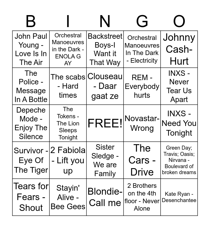 This bingo card has a free space and 51 words: Belinda Carlisle - Heaven is a place on earth, Kate Ryan - Desenchantee, Lasgo - Something, Blondie- Call me, 2 Fabiola - Lift you up, STEPPENWOLF - BORN TO BE WILD, Orchestral Manoeuvres in the Dark - ENOLA GAY, Radiohead - Karma Police, The Police - Message In A Bottle, Clouseau - Nobelprijs, The scabs - Hard times, Orchestral Manoeuvres In The Dark - Electricity, Green Day; Travis; Oasis; Nirvana - Boulevard of broken dreams, The Cars - Drive, Red Hot Chili Peppers - Under The Bridge, I'll Find My Way Home - Jon & Vangelis, Clouseau - Daar gaat ze, Novastar-Wrong, Bill Haley - Rock Around the Clock, Johnny Cash- Hurt, The Tokens - The Lion Sleeps Tonight, 2 Brothers on the 4th floor - Never Alone, John Paul Young - Love Is In The Air, REM - Everybody hurts, in the air tonight phil collins, Depeche Mode - Personal Jesus, INXS - Never Tear Us Apart, True - Spandau Ballet, Tears for Fears - Shout, Backstreet Boys-I Want it That Way, Abba Dancing Queen, Safety Dance - Men Without Hats, Bangles - Walk like an Egyptian, Scorpions Still Loving You, Red Hot Chili Peppers - Snow, Stayin' Alive - Bee Gees, The Beatles - All You Need Is Love, Johnny Cash - Ring Of Fire, Johnny Cash - I Walk The Line, Send Me an Angel - Scorpions, INXS - Need You Tonight, Survivor - Eye Of The Tiger, Indeep-Last Night A DJ Saved My Life, Puff Daddy - I'll Be Missing You, U2 - With or Without you, 2Pac - Changes, Depeche Mode - Enjoy The Silence, Gorki - Mia, Blondie - Heart of glass, Sister Sledge - We are Family and Gloria Gaynor i will survive.