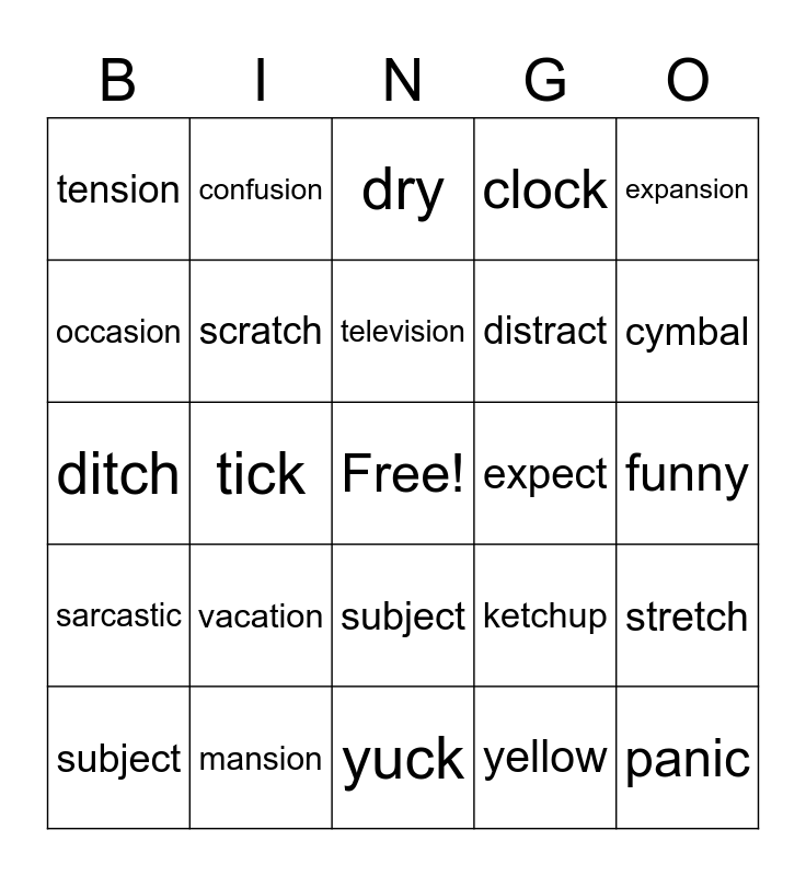 This bingo card has a free space and 24 words: vacation, mansion, television, subject, expansion, tension, occasion, confusion, expect, subject, distract, ditch, ketchup, stretch, scratch, yellow, funny, dry, cymbal, tick, panic, sarcastic, clock and yuck.