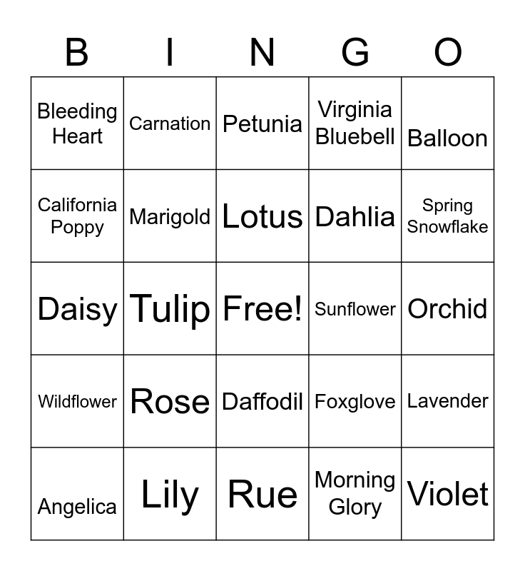 This bingo card has a free space and 24 words: Rose, Lily, Lotus, Angelica, Balloon, Bleeding Heart, California Poppy, Carnation, Sunflower, Daffodil, Dahlia, Daisy, Foxglove, Lavender, Marigold, Morning Glory, Orchid, Petunia, Spring Snowflake, Tulip, Violet, Wildflower, Virginia Bluebell and Rue.