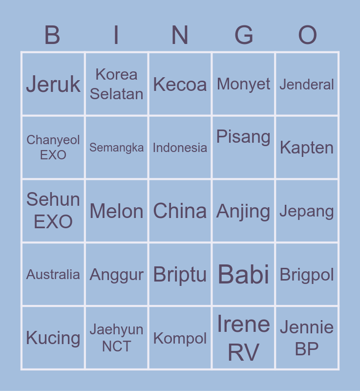 This bingo card has a free space and 24 words: Anggur, Jaehyun NCT, Indonesia, Kucing, Jenderal, Jeruk, Chanyeol EXO, Korea Selatan, Anjing, Briptu, Pisang, Sehun EXO, Babi, Brigpol, Semangka, Irene RV, Jepang, Kecoa, Kapten, Melon, Jennie BP, Australia, Monyet and Kompol.