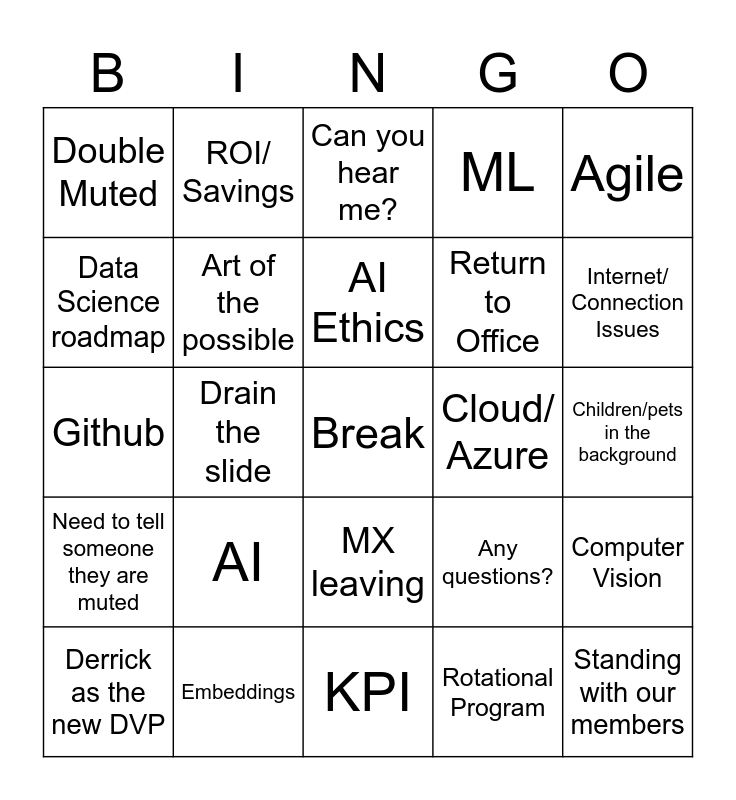 This bingo card has a free space and 24 words: AI, Embeddings, AI Ethics, Derrick as the new DVP, Agile, Double Muted, Data Science roadmap, ROI/ Savings, Cloud/ Azure, MX leaving, Return to Office, Github, Any questions?, Computer Vision, Art of the possible, Rotational Program, Children/pets in the background, Can you hear me?, Internet/ Connection Issues, Drain the slide, Standing with our members, Need to tell someone they are muted, ML and KPI.