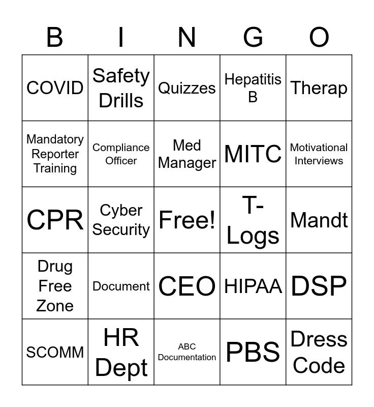 This bingo card has a free space and 24 words: Document, HR Dept, Med Manager, SCOMM, Therap, COVID, Mandatory Reporter Training, Safety Drills, T-Logs, CEO, MITC, CPR, HIPAA, DSP, Compliance Officer, PBS, Mandt, Quizzes, Motivational Interviews, Cyber Security, Dress Code, Drug Free Zone, Hepatitis B and ABC Documentation.
