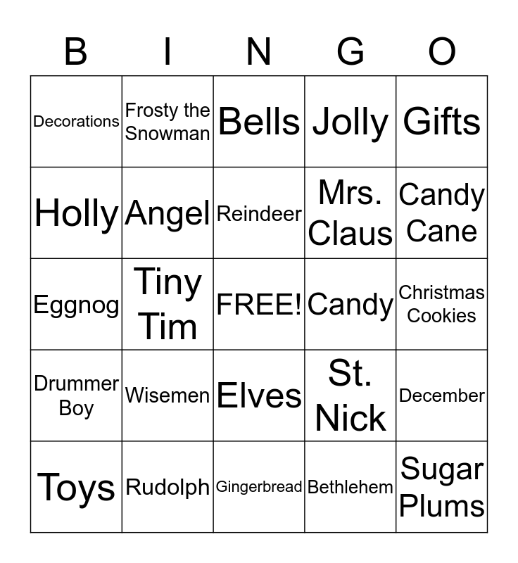 This bingo card has a free space and 24 words: Wisemen, Rudolph, Reindeer, Toys, Gifts, Decorations, Holly, Frosty the Snowman, Candy, Elves, Mrs. Claus, Eggnog, St. Nick, December, Angel, Bethlehem, Christmas Cookies, Bells, Candy Cane, Tiny Tim, Sugar Plums, Drummer Boy, Jolly and Gingerbread.