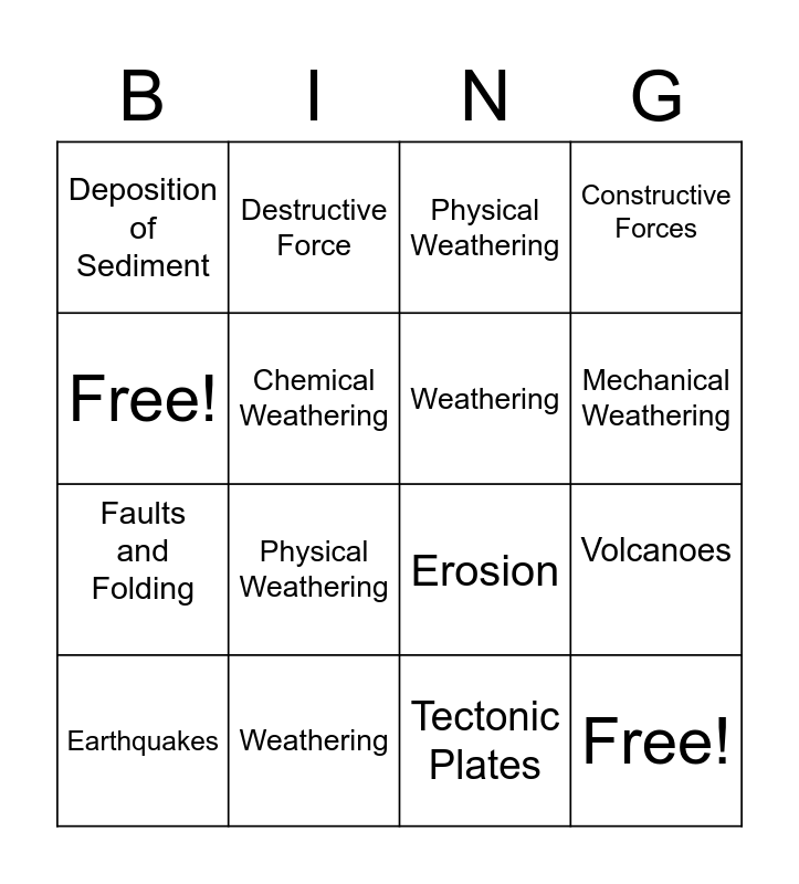 This bingo card has 16 words: Weathering, Volcanoes, Physical Weathering, Deposition of Sediment, Faults and Folding, Destructive Force, Erosion, Tectonic Plates, Free!, Chemical Weathering, Earthquakes, Constructive Forces, Physical Weathering, Mechanical Weathering, Weathering and Free!.