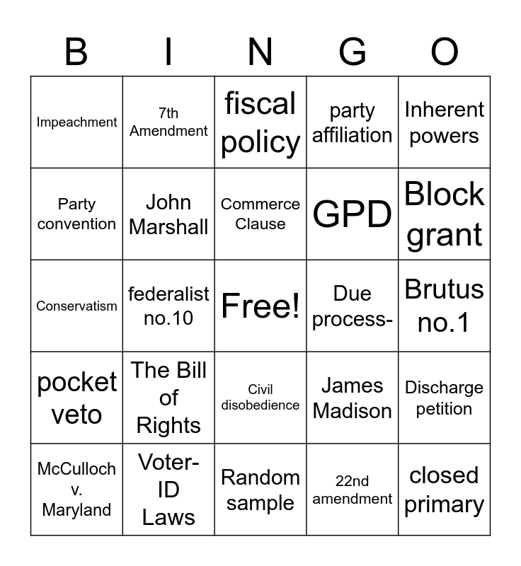 This bingo card has a free space and 24 words: The Bill of Rights, Voter-ID Laws, Commerce Clause, McCulloch v. Maryland, Inherent powers, Impeachment, Party convention, 7th Amendment, Due process-, Civil disobedience, GPD, Conservatism, James Madison, Discharge petition, John Marshall, 22nd amendment, Brutus no.1, fiscal policy, Block grant, federalist no.10, closed primary, pocket veto, party affiliation and Random sample.