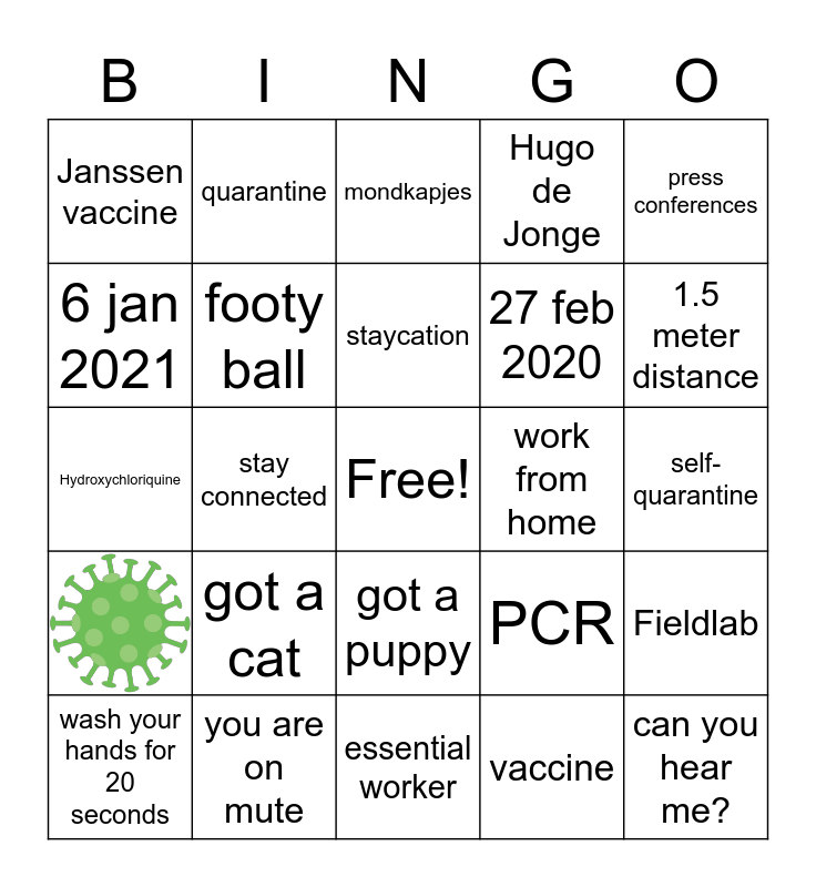 This bingo card has 1 images, a free space and 43 words: virtual learning, can you hear me?, toilet paper, wash your hands for 20 seconds, virtual happy hour, vaccine, mondkapjes, avondklok, press conferences, you are on mute, Hugo de Jonge, work from home, got a puppy, got a cat, cut your own hair, essential worker, flatten the curve, Hydroxychloriquine, brandstichting mast, 1.5 meter distance, quarantine, Fauci, GGD, Janssen vaccine, RIVM, self-quarantine, shop by appointment, new normal, PCR, AstraZeneca, Fieldlab, virtual training, zoom calls, stay connected, stay at home, 10,000 steps per day, hair dressers, staycation, 6 jan 2021, 27 feb 2020, coronamaatregelen, footy ball and haw pin.