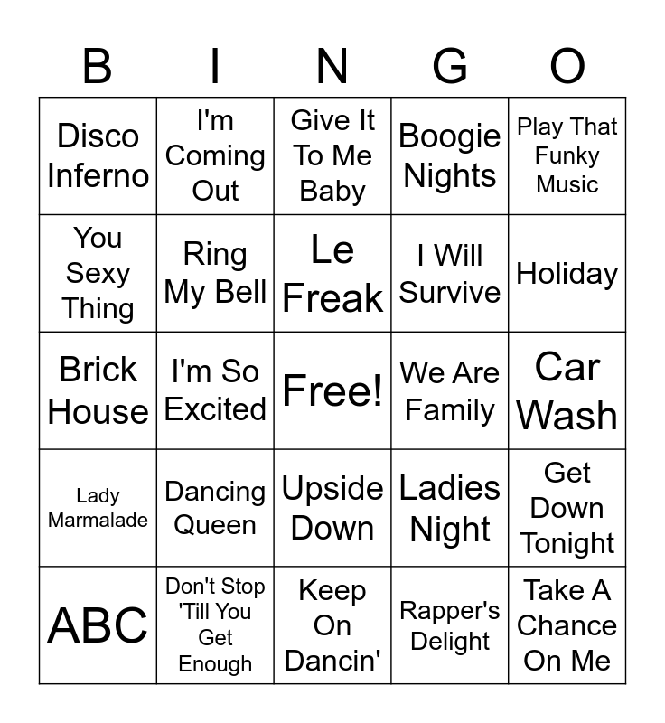 This bingo card has a free space and 24 words: Dancing Queen, Don't Stop 'Till You Get Enough, Le Freak, ABC, Play That Funky Music, Disco Inferno, You Sexy Thing, I'm Coming Out, We Are Family, Upside Down, I Will Survive, Brick House, Ladies Night, Get Down Tonight, Ring My Bell, Rapper's Delight, Car Wash, Give It To Me Baby, Holiday, I'm So Excited, Take A Chance On Me, Lady Marmalade, Boogie Nights and Keep On Dancin'.