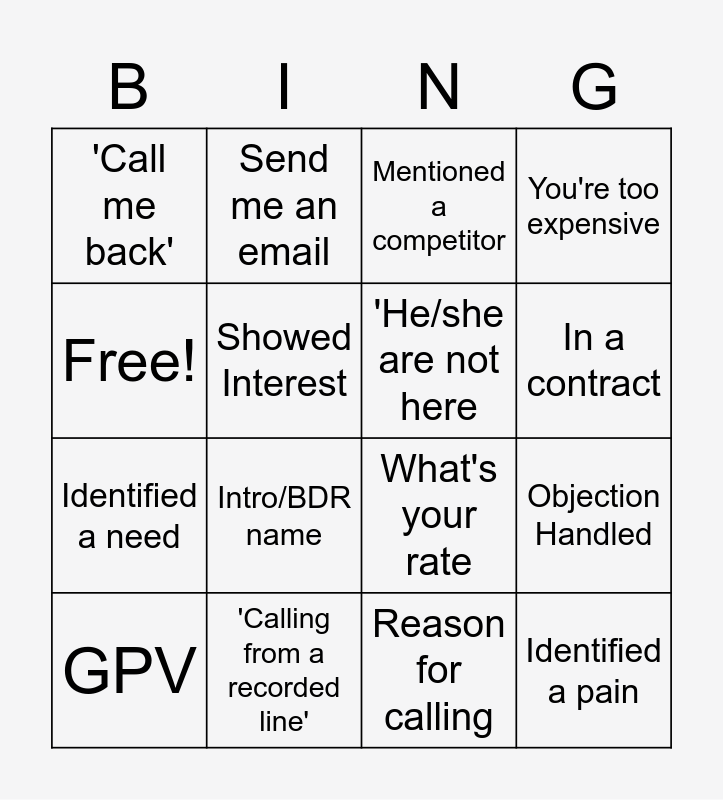 This bingo card has 16 words: 'Calling from a recorded line', Objection Handled, Mentioned a competitor, 'Call me back', Identified a need, Send me an email, What's your rate, Reason for calling, Free!, Showed Interest, GPV, You're too expensive, Intro/BDR name, In a contract, 'He/she are not here and Identified a pain.