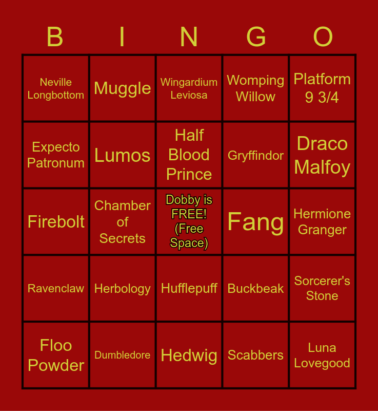 This bingo card has a free space and 69 words: Harry Potter, Hermione Granger, Hogwarts Express, Privet Drive, Dumbledore, Prizoner of Azkaban, Womping Willow, Golden Snitch, Platform 9 3/4, Mirror of Erised, Sorcerer's Stone, Ollivander, Neville Longbottom, Wingardium Leviosa, Dudley Dursley, Chamber of Secrets, Hufflepuff, Gryffindor, Slytherin, Ravenclaw, Fang, Buckbeak, Draco Malfoy, Ron Weasley, Professor Snape, Hogwarts, Mandrake, Order of the Phoenix, Scabbers, Marauder's Map, Muggle, Quidditch, Butterbeer, Bludgers, Black Forest, Hogsmeade, Chocolate Frogs, Death Eater, Expecto Patronum, Dementor, Herbology, Luna Lovegood, Wizard, Moaning Myrtle, Diagon Alley, Floo Powder, Nearly Headless Nick, Sirius Black, Wand, Lumos, Half Blood Prince, Tom Riddle, Basilisk, Hedwig, Expelliarmus, Crucio, Avada Kedavra, Potions, Defense against the Dark Arts, Firebolt, Nimbus 2000, Gillyweed, Cedric Diggory, Dragon, Norbert, Gringotts, Bellatrix Lestrange, House Cup and Horcrux.