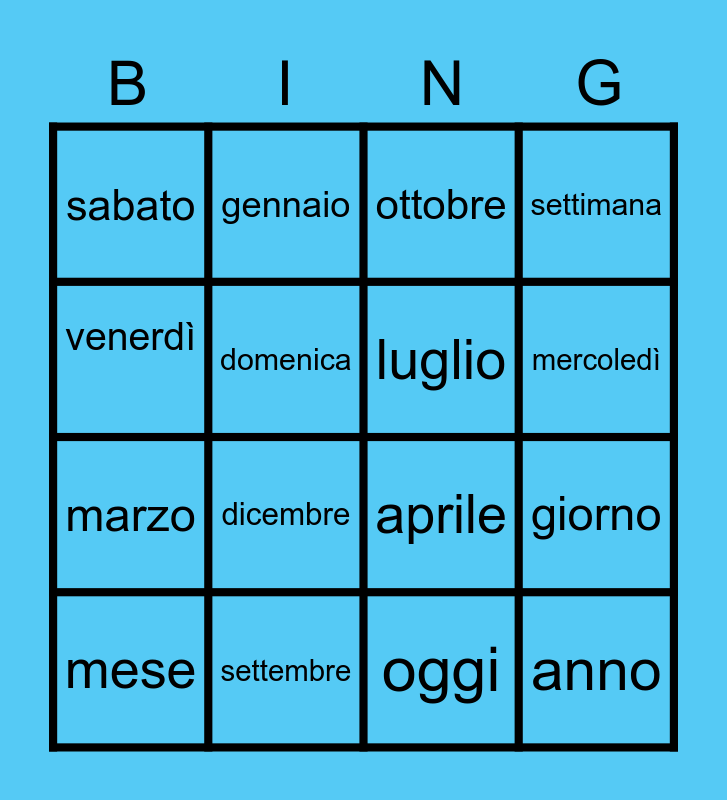 This bingo card has 24 words: lunedi, martedì, mercoledì, giovedi, venerdì, sabato, domenica, gennaio, settembre, febraio, marzo, aprile, maggio, giugnio, luglio, agosto, oggi, ottobre, dicembre, giorno, mese, anno, settimana and calendario.