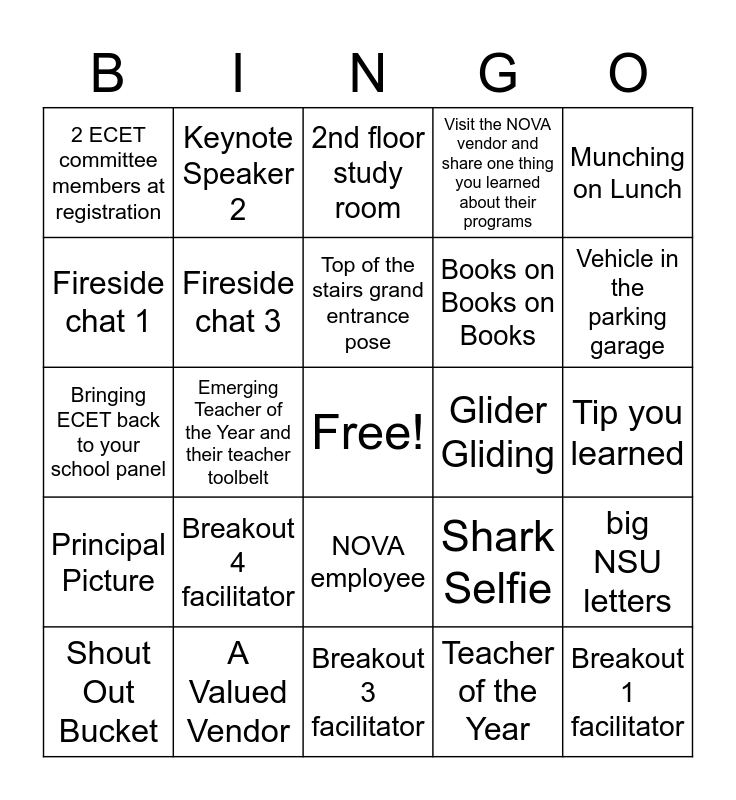 This bingo card has a free space and 50 words: NOVA entrance sign, Breakout 1 facilitator, Breakout 2 facilitator, Breakout 3 facilitator, Breakout 4 facilitator, Keynote Speaker 1, Keynote Speaker 2, Keynote Speaker 3, Fireside chat 1, Fireside chat 2, Fireside chat 3, Visit the NOVA vendor and share one thing you learned about their programs, big NSU letters, Shark Selfie, Skeleton Selfie, A Beach & A Bestie, Top of the stairs grand entrance pose, Glider Gliding, Breakfast Box, Munching on Lunch, Emerging Teacher of the Year and their teacher toolbelt, Teacher of the Year, 2 ECET committee members at registration, Books on Books on Books, NOVA President Pic, STEM materials, Vehicle in the parking garage, On the lawn, 2nd floor study room, NOVA employee, Motivator Hype Emcee, Drum Fun, ECET committee member shirt with a hashtag you love, Colleague with a Coffee, A Valued Vendor, Friends socially distanced in the courtyard, Camera Crew, Arrow, Mask you love, Tip you learned, Tech tool, Why of teaching, Funny moment, ECET committee member in action, Shout Out Bucket, Bringing ECET back to your school panel, Retweet a colleague’s tweet, Follow Thomas Glanton on Twitter, @ThomasGlanton, Principal Picture and Follow a colleague on Twitter.