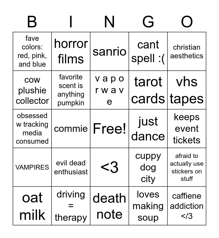 This bingo card has a free space and 24 words: evil dead enthusiast, driving = therapy, v a p o r w a v e, oat milk, christian aesthetics, fave colors: red, pink, and blue, cow plushie collector, horror films, just dance, <3, tarot cards, obsessed w tracking media consumed, cuppy dog city, afraid to actually use stickers on stuff, favorite scent is anything pumpkin, loves making soup, keeps event tickets, sanrio, vhs tapes, commie, caffiene addiction </3, VAMPIRES, cant spell :( and death note.