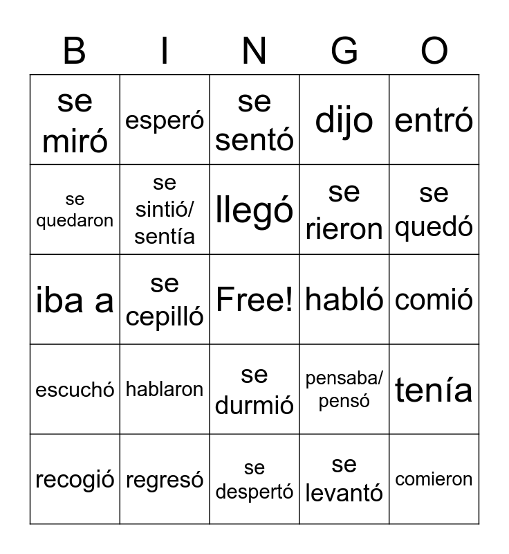 This bingo card has a free space and 29 words: recogió, se arregló, se cepilló, fue, se miró, se sentó, se sintió/ sentía, hablaron, habló, regresó, comió, comieron, se despertó, se levantó, se quedó, no sabía, se durmió, escuchó, entró, iba a, pensaba/ pensó, se rió, se rieron, se quedaron, dijo, esperó, tenía, llegó and era.