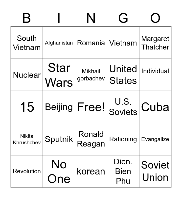This bingo card has a free space and 24 words: Sputnik, No One, Mikhail gorbachev, Revolution, Margaret Thatcher, South Vietnam, Nuclear, Afghanistan, U.S. Soviets, Ronald Reagan, United States, 15, Rationing, Evangalize, Star Wars, Dien. Bien Phu, Cuba, Romania, Individual, Beijing, Soviet Union, Nikita Khrushchev, Vietnam and korean.