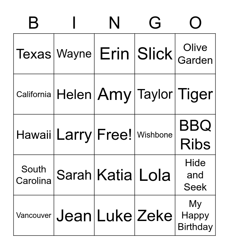 This bingo card has a free space and 59 words: Illinois, Jean, Ethan, Clancy, Hide and Seek, Florida, Helen, Peter, Wishbone, Thanksgiving, California, Ed, Taylor, Cubs, Alaska, Wayne, Amy, Slick, Sky Blue, Hawaii, Larry, Erin, Carly, BBQ Ribs, Washington D.C., Tom, Katia, Jordan, Olive Garden, Tennessee, Ron, Seth, Wrigley, Bible, Texas, Duane, Wes, Lola, Jeopardy, South Carolina, Lori, Luke, Zeke, Sound of Music, Minnesota, Sharon, Danny, Penny, Tiger, Vancouver, John, Michelle, Frisky, My Happy Birthday, Indiana, Sarah, Jack, Sig and Smoky.