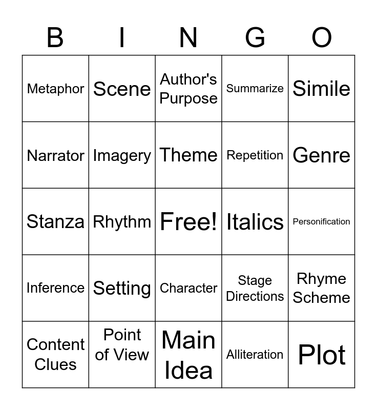 This bingo card has a free space and 24 words: Setting, Point of View, Theme, Content Clues, Simile, Metaphor, Narrator, Scene, Italics, Character, Repetition, Stanza, Stage Directions, Rhyme Scheme, Imagery, Alliteration, Personification, Author's Purpose, Genre, Rhythm, Plot, Inference, Summarize and Main Idea.
