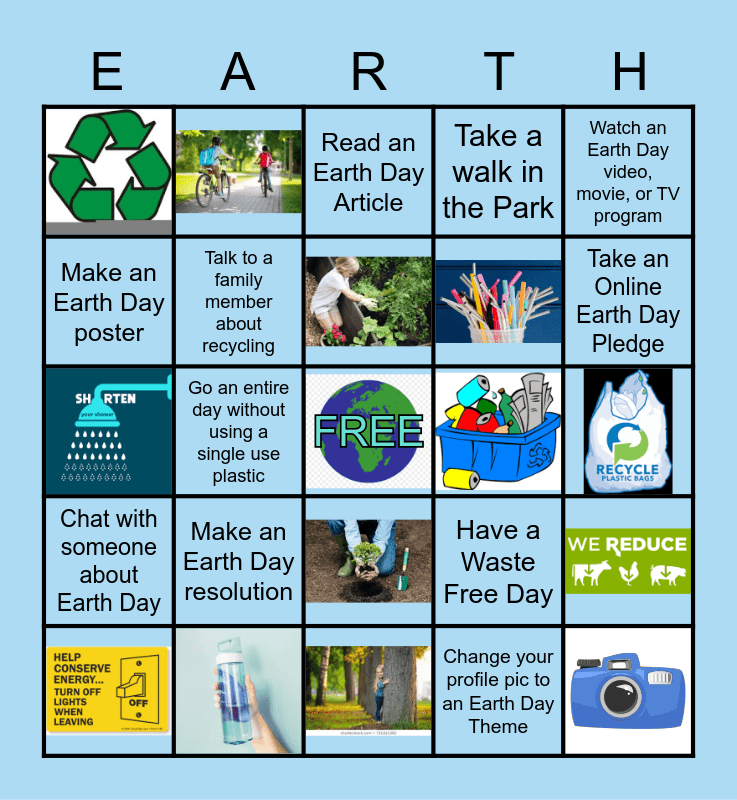 This bingo card has 16 images, a free space and 13 words: Go an entire day without using a single use plastic, Read an Earth Day Article, Talk to a family member about recycling, Make an Earth Day resolution, Change your profile pic to an Earth Day Theme, Take an Online Earth Day Pledge, Sit and listen to nature for 5 min, Chat with someone about Earth Day, Watch an Earth Day video, movie, or TV program, Have a Waste Free Day, Unplug your phone charger when not being used, Make an Earth Day poster and Take a walk in the Park.