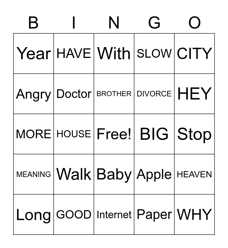 This bingo card has a free space and 133 words: AGAIN, DEAF, HEARING, CHURCH, LEARN, LIKE, MEANING, MEET, NAME, NICE, NO, SIGN, YOUR, STUDENT, TEACH, TEACHER, THANK YOU, UNDERSTAND, WHAT, WHERE, WHO, GOOD, WHY, YES, GIRL, BOY, BROTHER, CHILD, CHRISTIAN, FATHER, DIVORCE, HAVE, HEAVEN, HEY, HOW, LIVE, MARRIAGE, MOM, SINGLE, SISTER, SLOW, FINGERSPELL, WORK, HOW-MANY, ALL, ASK, BAD, BATHROOM, BIG, CITY, CLASS, COME, FAMILY, FAVORITE, FINE, FROM, GO, HELLO, HERE, HOUSE, MORE, NEED, SCHOOL, SO-SO, SMALL, THINK, RAISED, WANT, don’t-LIKE, Angry, Aunt, Baby, Bed, Cry, Excuse, Friend, Happy, Hurt, Idea, Live, Sad, Son, Sorry, Stop, Uncle, Wash, Can, Car, Church, Computer, Doctor, Email, Give, Home, Internet, Play, Put, Sit, Stand, Stay, Store, Walk, With, Color, Black, Red, Blue, Green, White, Finish, Future, Long, Now, Paper, Tomorrow, Wait, When, Year, And, Apple, Cereal, Cheese, Cookie, Drink, Eat, Egg, Taste, Hamburger, Hotdog, Milk, Pizza, Popcorn and Water.