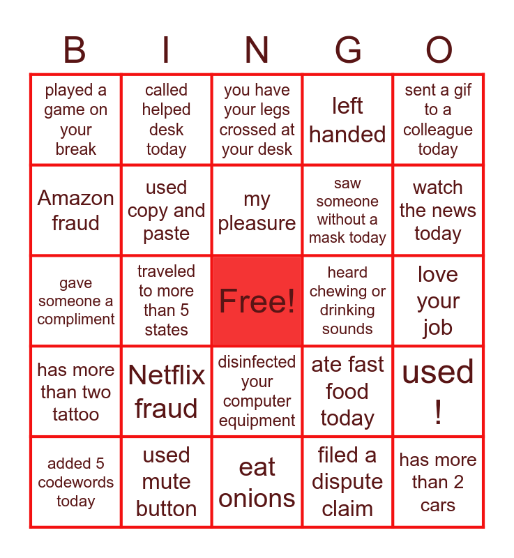 This bingo card has a free space and 24 words: Netflix fraud, used mute button, my pleasure, added 5 codewords today, sent a gif to a colleague today, played a game on your break, Amazon fraud, called helped desk today, heard chewing or drinking sounds, disinfected your computer equipment, saw someone without a mask today, gave someone a compliment, ate fast food today, used !, used copy and paste, filed a dispute claim, love your job, you have your legs crossed at your desk, watch the news today, traveled to more than 5 states, has more than 2 cars, has more than two tattoo, left handed and eat onions.