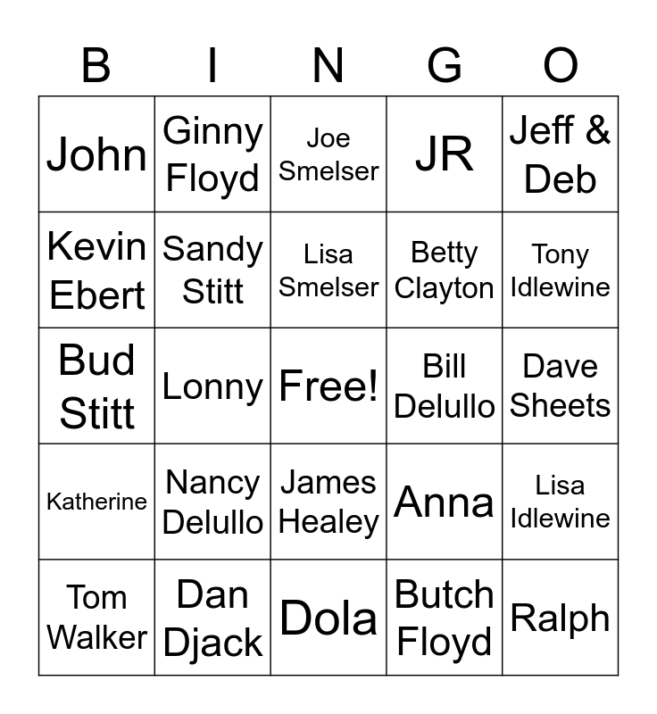 This bingo card has a free space and 24 words: Nancy Delullo, Dan Djack, Lisa Smelser, Tom Walker, Jeff & Deb, John, Kevin Ebert, Ginny Floyd, Bill Delullo, James Healey, Betty Clayton, Bud Stitt, Anna, Lisa Idlewine, Sandy Stitt, Butch Floyd, Dave Sheets, Joe Smelser, Tony Idlewine, Lonny, Ralph, Katherine, JR and Dola.