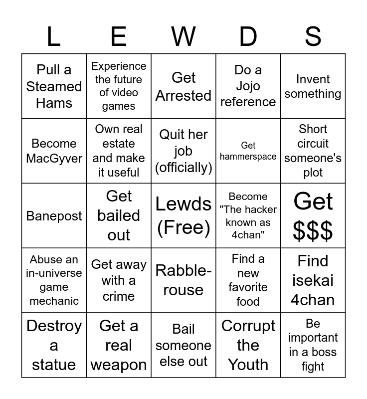 This bingo card has a free space and 24 words: Get away with a crime, Get a real weapon, Quit her job (officially), Destroy a statue, Invent something, Pull a Steamed Hams, Become MacGyver, Experience the future of video games, Become "The hacker known as 4chan", Rabble-rouse, Get hammerspace, Banepost, Find a new favorite food, Find isekai 4chan, Own real estate and make it useful, Corrupt the Youth, Get $$$, Get Arrested, Short circuit someone's plot, Get bailed out, Be important in a boss fight, Abuse an in-universe game mechanic, Do a Jojo reference and Bail someone else out.