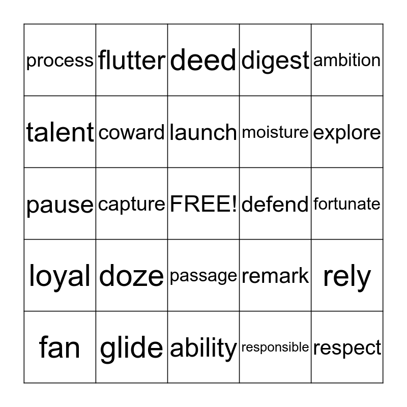 This bingo card has a free space and 24 words: doze, glide, launch, fan, ambition, process, talent, flutter, defend, passage, moisture, pause, remark, rely, coward, responsible, fortunate, deed, explore, capture, respect, loyal, digest and ability.