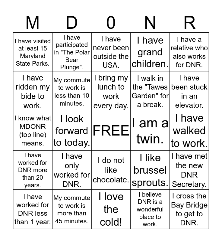 This bingo card has a free space and 24 words: I have only worked for DNR., My commute to work is more than 45 minutes., I bring my lunch to work every day., I have worked for DNR less than 1 year., I have a relative who also works for DNR., I have visited at least 15 Maryland State Parks., I have ridden my bide to work., I have participated in "The Polar Bear Plunge"., I am a twin., I do not like chocolate., I walk in the "Tawes Garden" for a break., I know what MDONR (top line) means., I like brussel sprouts., I have met the new DNR Secretary., My commute to work is less than 10 minutes., I believe DNR is a wonderful place to work., I have walked to work., I have never been outside the USA., I have been stuck in an elevator., I look forward to today., I cross the Bay Bridge to get to DNR., I have worked for DNR more than 20 years., I have grand children. and I love the cold!.