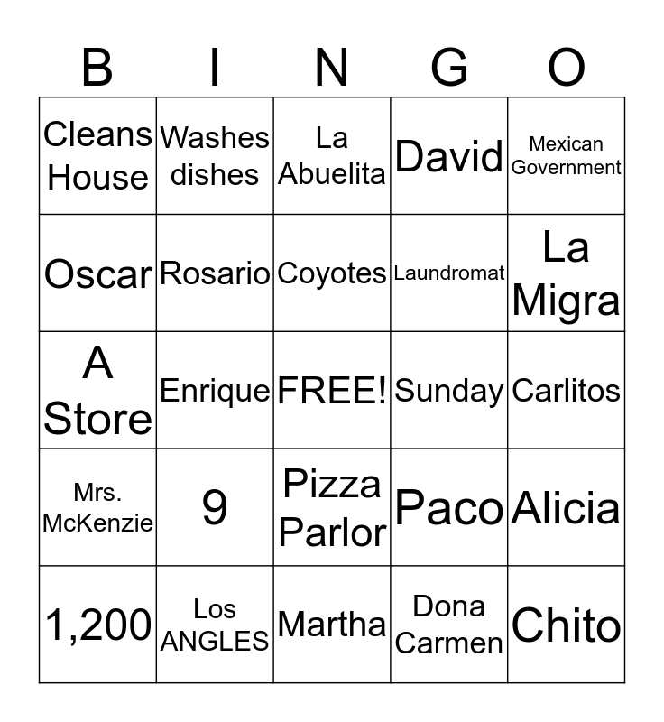 This bingo card has a free space and 24 words: 9, Los ANGLES, Coyotes, 1,200, Mexican Government, Cleans House, Oscar, Washes dishes, Sunday, Pizza Parlor, Laundromat, A Store, Paco, Alicia, Rosario, Dona Carmen, Carlitos, La Abuelita, La Migra, Enrique, Chito, Mrs. McKenzie, David and Martha.