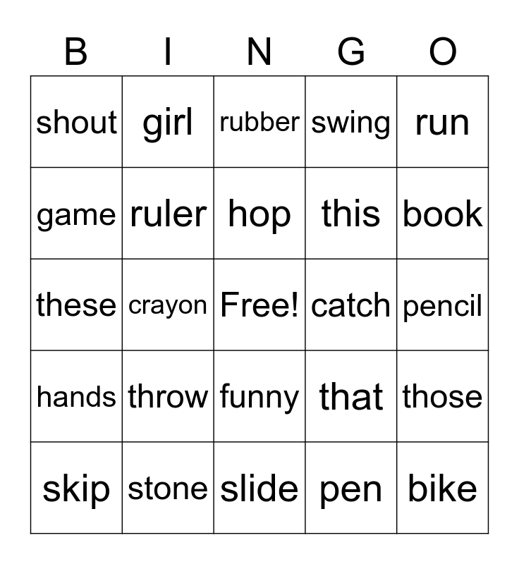 This bingo card has a free space and 24 words: throw, stone, hop, skip, run, shout, game, girl, catch, funny, this, these, that, those, ruler, pen, pencil, rubber, book, crayon, bike, hands, swing and slide.