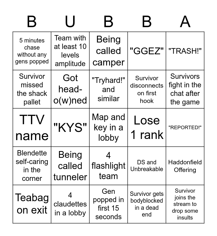 This bingo card has a free space and 24 words: Being called tunneler, 4 claudettes in a lobby, "Tryhard!" and similar, Teabag on exit, "TRASH!", 5 minutes chase without any gens popped, Survivor missed the shack pallet, Team with at least 10 levels amplitude, Lose 1 rank, 4 flashlight team, Survivor disconnects on first hook, TTV name, DS and Unbreakable, Haddonfield Offering, Got head-o(w)ned, Survivor gets bodyblocked in a dead end, "REPORTED!", Being called camper, Survivors fight in the chat after the game, "KYS", Survivor joins the stream to drop some insults, Blendette self-caring in the corner, "GGEZ" and Gen popped in first 15 seconds.