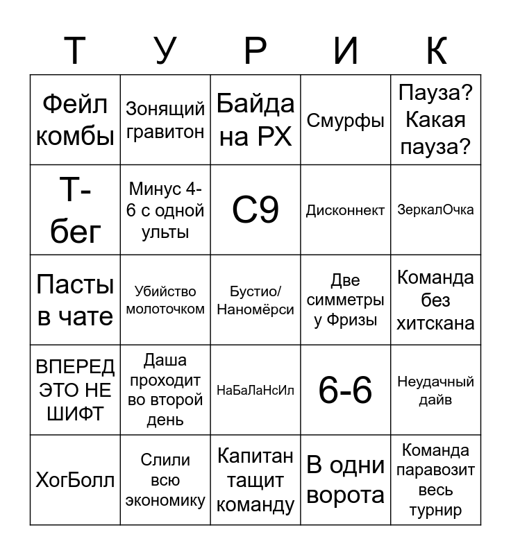This bingo card has a free space and 24 words: Даша проходит во второй день, Слили всю экономику, С9, ХогБолл, Пауза? Какая пауза?, Фейл комбы, Т-бег, Зонящий гравитон, Две симметры у Фризы, НаБаЛаНсИл, Дисконнект, Пасты в чате, 6-6, Неудачный дайв, Минус 4-6 с одной ульты, В одни ворота, Команда без хитскана, Байда на РХ, ЗеркалОчка, Убийство молоточком, Команда паравозит весь турнир, ВПЕРЕД ЭТО НЕ ШИФТ, Смурфы and Капитан тащит команду.