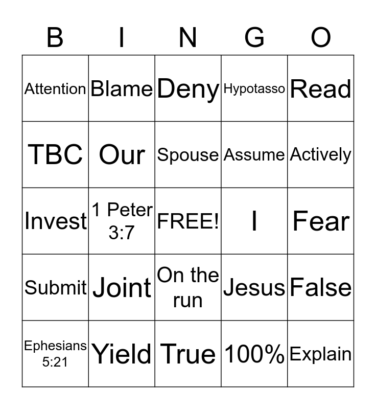 This bingo card has a free space and 24 words: Joint, Yield, Spouse, Ephesians 5:21, Read, Attention, TBC, Blame, I, On the run, Assume, Invest, Jesus, False, Our, 100%, Fear, Deny, Actively, 1 Peter 3:7, Explain, Submit, Hypotasso and True.