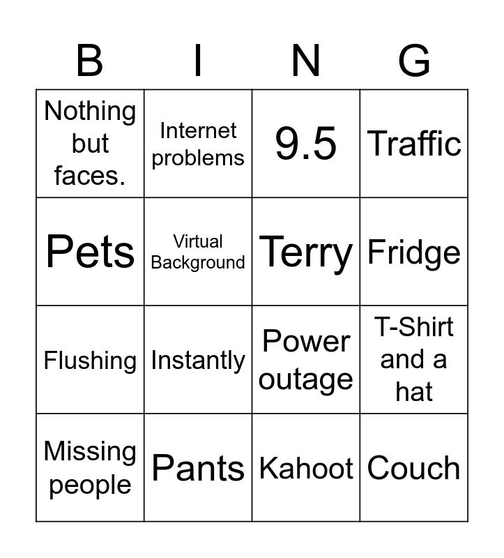 This bingo card has 24 words: Typing, Muted, Fridge, Children, Pets, Nothing but faces., Virtual Background, Internet problems, Pants, WhatsApp, Flushing, Power outage, JIRA, Andrew, Terry, Upgrade, Kahoot, 9.5, Instantly, T-Shirt and a hat, Missing people, Couch, Traffic and Coffee.