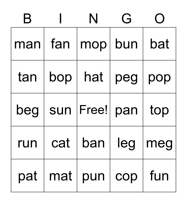 This bingo card has a free space and 24 words: cat, mat, hat, pat, bat, man, tan, fan, pan, ban, peg, beg, leg, meg, bop, cop, top, mop, pop, sun, fun, run, bun and pun.