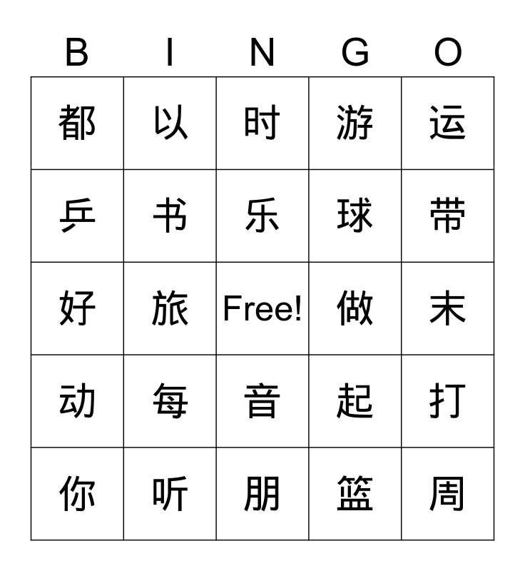 This bingo card has a free space and 40 words: 爱, 好, 读, 书, 听, 音, 乐, 云, 运, 动, 旅, 游, 周, 末, 做, 每, 六, 都, 有, 时, 打, 篮, 球, 乒, 乓, 真, 的, 吗, 能, 不, 和, 你, 一, 起, 带, 朋, 友, 可, 以 and 啊.