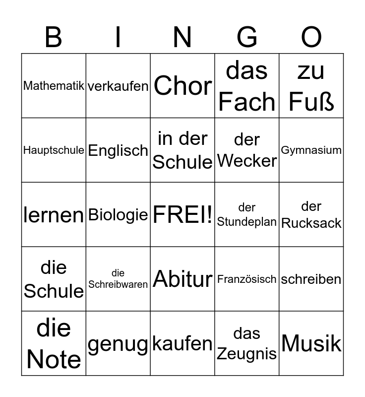 This bingo card has a free space and 36 words: Geschichte, Kunst, Deutsch, Englisch, Französisch, die Schule, in der Schule, mit dem Bus, zu Fuß, mit dem Auto, Biologie, das Fach, die Klasse, der Stundeplan, Gymnasium, Mathematik, Sport, die Schreibwaren, Musik, Chor, der Rucksack, schreiben, genug, die Note, kaufen, verkaufen, lernen, der Rechner, der Wecker, Hauptschule, Realschule, Grundschule, das Zeugnis, Abitur, der Schüler and die Schülerin.
