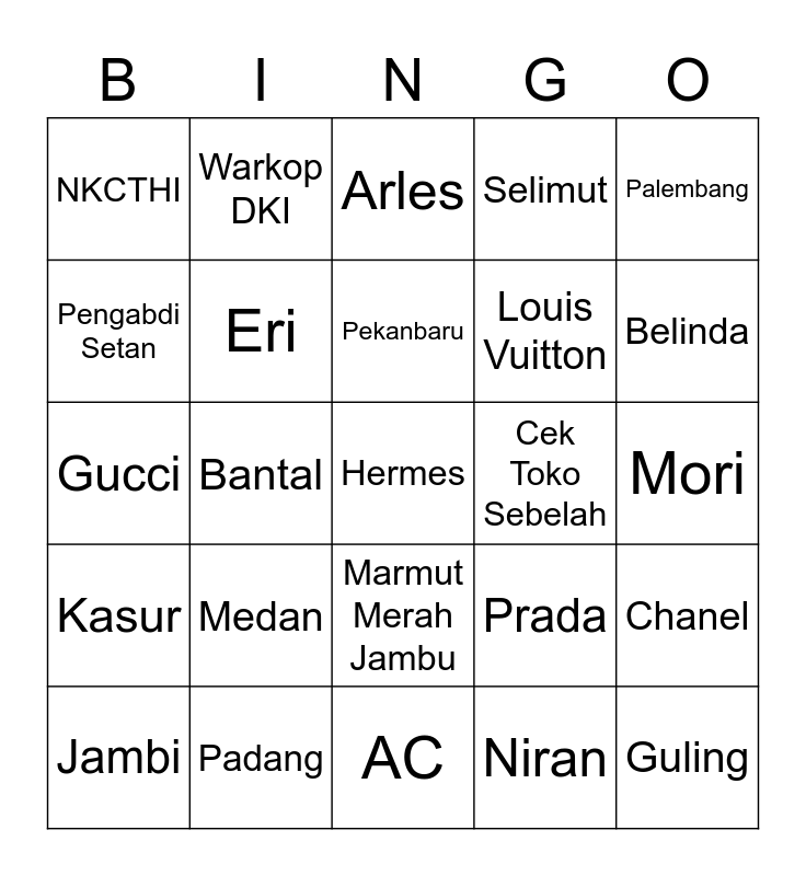 This bingo card has a free space and 24 words: Medan, Padang, Pekanbaru, Jambi, Palembang, NKCTHI, Pengabdi Setan, Warkop DKI, Cek Toko Sebelah, Marmut Merah Jambu, Louis Vuitton, Gucci, Prada, Chanel, Eri, Niran, Mori, Arles, Belinda, Bantal, Guling, Kasur, Selimut and AC.