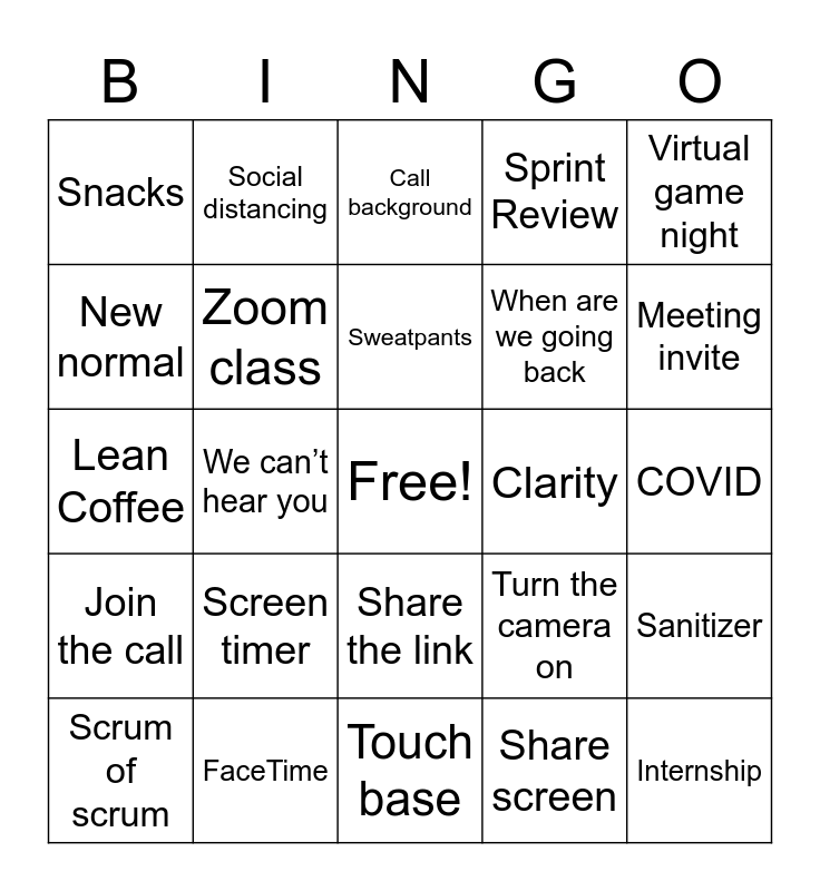 This bingo card has a free space and 32 words: Share screen, Mute, We can’t hear you, Can you see my screen, Join the call, Zoom class, Virtual game night, Sanitizer, Social distancing, Mask, Sweatpants, Call background, Connecting audio, Calibration, Clarity, Chauncey Friday, Scrum of scrum, Lean Coffee, Share the link, Screen timer, Turn the camera on, Vaccine, COVID, FaceTime, Internship, Sprint Review, When are we going back, New normal, Snacks, Touch base, In a call and Meeting invite.