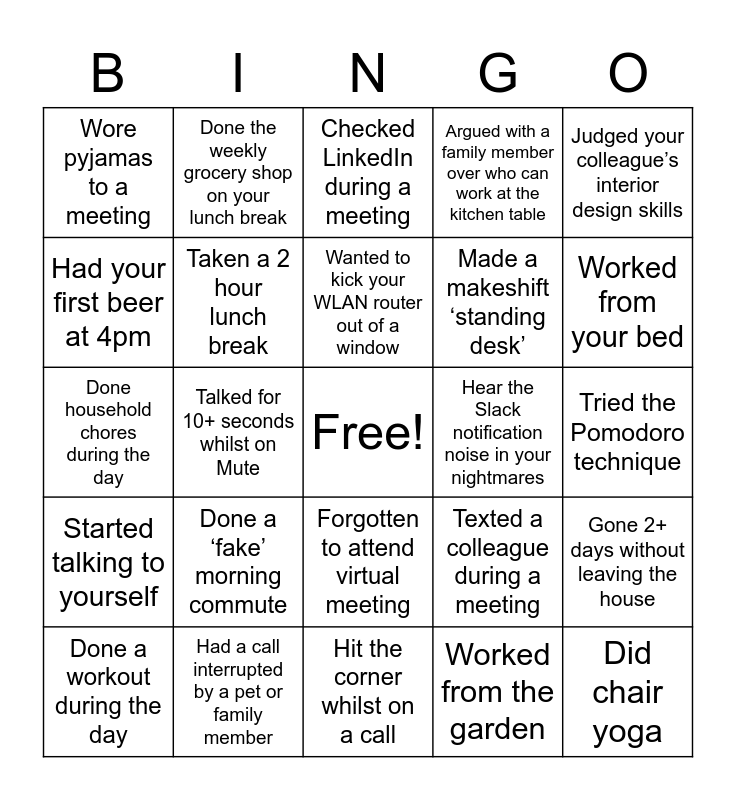 This bingo card has a free space and 30 words: Had a call interrupted by a pet or family member, Napped during the day, Talked for 10+ seconds whilst on Mute, Installed a blue light blocker on your monitor, Wore pyjamas to a meeting, Checked LinkedIn during a meeting, Taken a 2 hour lunch break, Forgotten to attend virtual meeting, Hear the Slack notification noise in your nightmares, Hit the corner whilst on a call, Tried the Pomodoro technique, Did chair yoga, Worked from the garden, Lieferando’ed your lunch, Worked from your bed, ‘Can you see my screen?’, Texted a colleague during a meeting, Started talking to yourself, Done a ‘fake’ morning commute, Judged your colleague’s interior design skills, Done household chores during the day, Made a Home Office playlist, Done the weekly grocery shop on your lunch break, Made a makeshift ‘standing desk’, Had your first beer at 4pm, Argued with a family member over who can work at the kitchen table, Gone 2+ days without leaving the house, Done a workout during the day, Wanted to kick your WLAN router out of a window and Secretly preferred working from home.