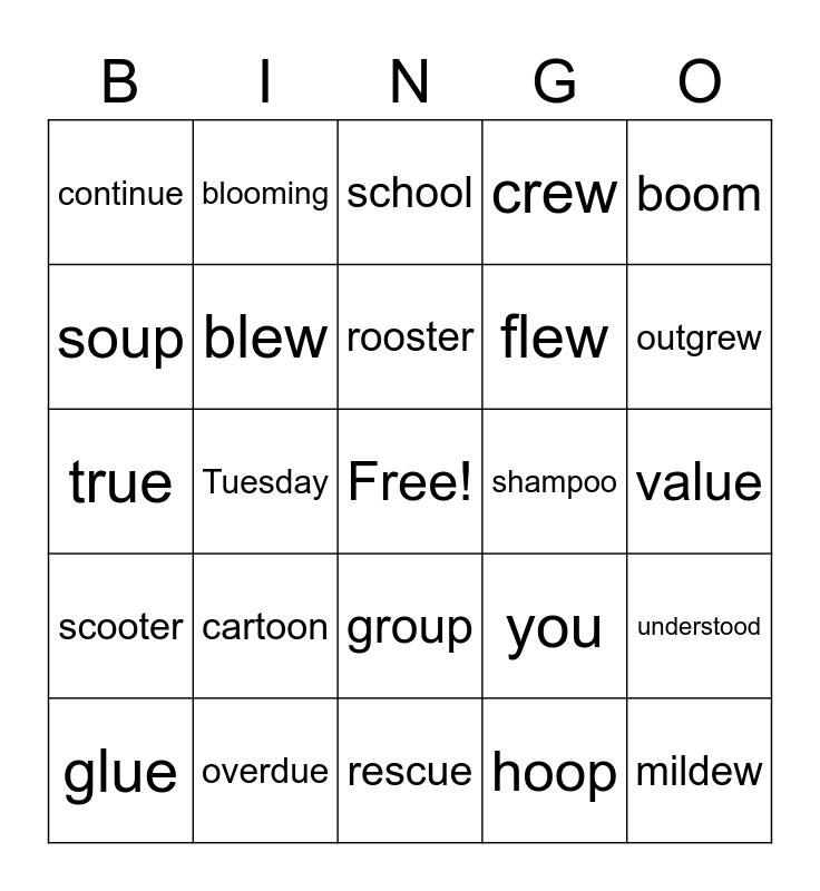 This bingo card has a free space and 29 words: glue, stew, Tuesday, zookeeper, continue, school, blew, cartoon, shampoo, overdue, value, mildew, rescue, hoop, outgrew, igloo, group, scooter, boom, true, you, grew, flew, soup, crew, blooming, understood, rooster and youth.