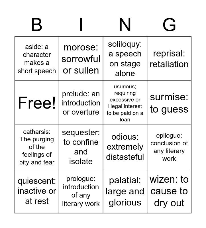This bingo card has 16 words: prologue: introduction of any literary work, epilogue: conclusion of any literary work, soliloquy: a speech on stage alone, aside: a character makes a short speech, catharsis: The purging of the feelings of pity and fear, morose: sorrowful or sullen, odious: extremely distasteful, palatial: large and glorious, Free!, prelude: an introduction or overture, quiescent: inactive or at rest, reprisal: retaliation, sequester: to confine and isolate, surmise: to guess, usurious; requiring excessive or illegal interest to be paid on a loan and wizen: to cause to dry out.