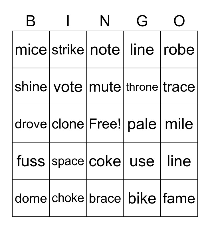 This bingo card has a free space and 24 words: space, choke, mute, dome, robe, mice, shine, strike, pale, coke, throne, drove, use, line, vote, bike, mile, note, trace, clone, fame, fuss, line and brace.