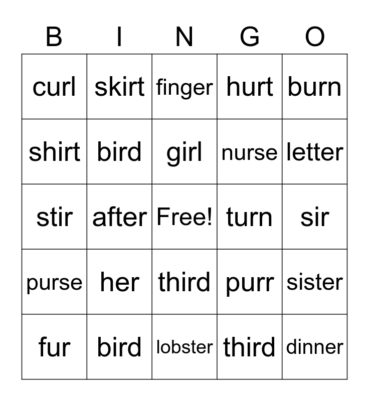 This bingo card has a free space and 24 words: her, bird, girl, fur, burn, curl, shirt, skirt, turn, third, nurse, stir, purr, sister, bird, third, sir, finger, letter, after, dinner, purse, hurt and lobster.