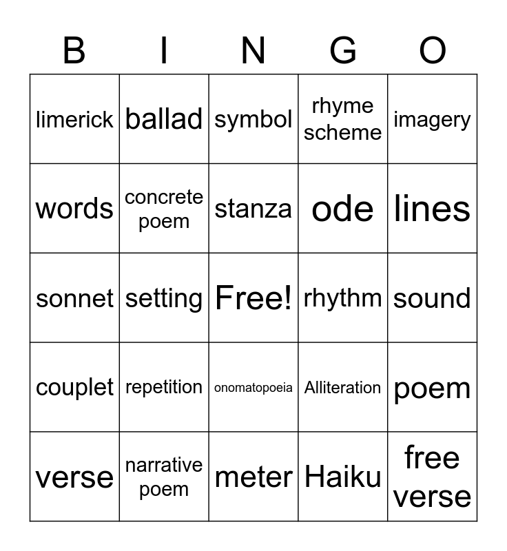 This bingo card has a free space and 29 words: verse, rhyme, setting, theme, limerick, symbol, concrete poem, repetition, rhythm, narrative poem, sound, free verse, meter, Haiku, lines, genre, onomatopoeia, couplet, imagery, sonnet, Alliteration, tone, ode, words, rhyme scheme, ballad, poem, stanza and voice.