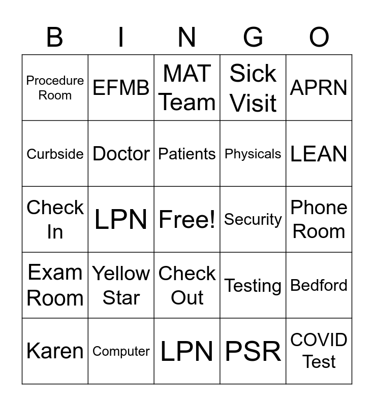 This bingo card has a free space and 32 words: PSR, Triage, LPN, MA, Exam Room, Doctor, APRN, Bedford, EFMB, EIMB, Patients, MAT Team, Jeff, Dana, Security, Kim, Karen, Check In, Check Out, Yellow Star, Testing, Rooming, Phone Room, Computer, COVID Test, Sick Visit, Physicals, Curbside, Procedure Room, LPN, Huddle and LEAN.