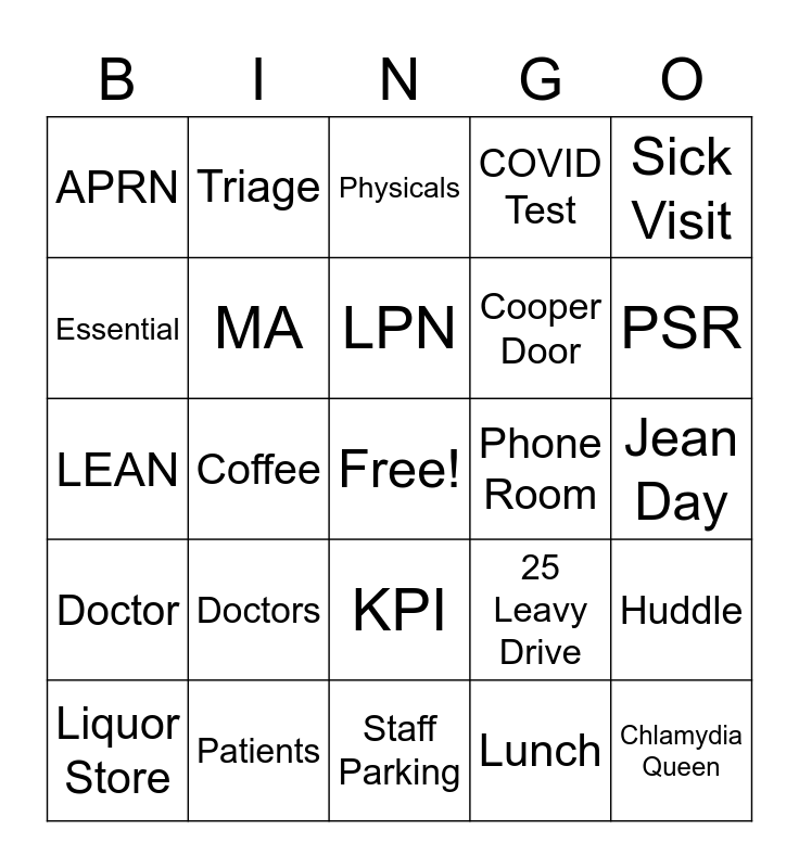 This bingo card has a free space and 27 words: 25 Leavy Drive, Dunkin Donuts, Cooper Door, Staff Parking, Essential, Physicals, Triage, Doctor, Phone Room, Huddle, LEAN, COVID Test, Liquor Store, Patients, PSR, Triage, MA, LPN, Doctors, APRN, Jean Day, Lunch, Coffee, Chlamydia Queen, KPI, Sick Visit and Procedure Room.